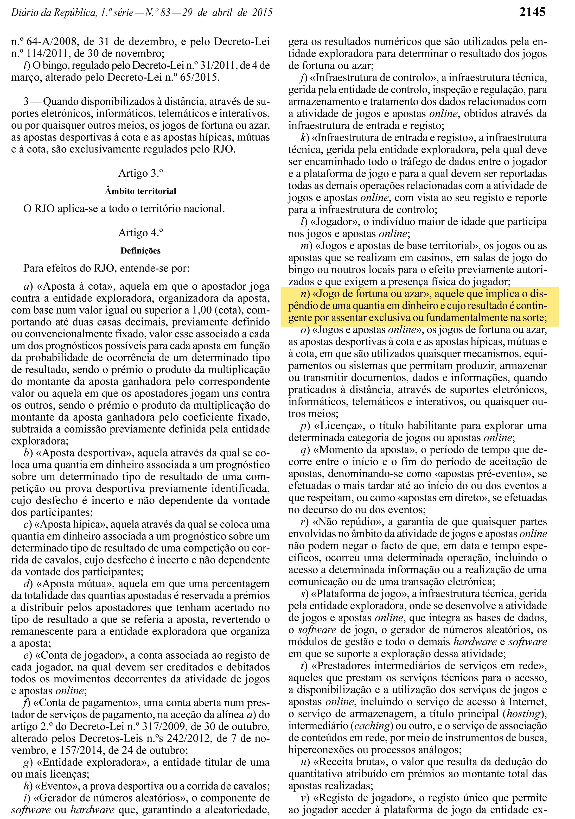 O Decreto-Lei 66/2015, de 29 de abril, define jogos de fortuna ou azar como “aqueles que implicam o dispêndio de uma quantia em dinheiro e cujo resultado é contingente por assentar exclusiva ou fundamentalmente na sorte”.